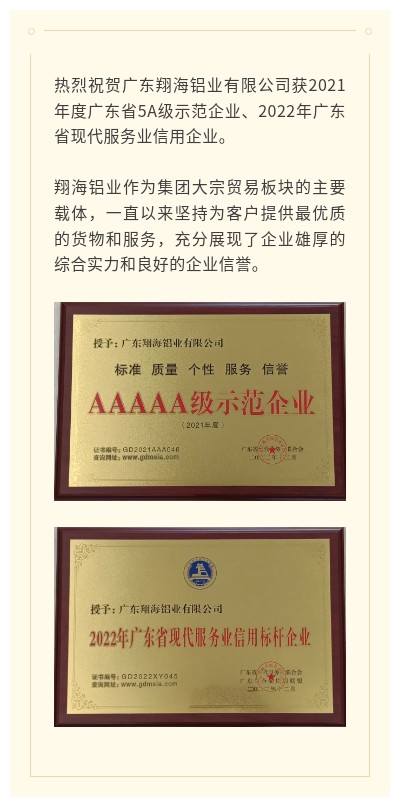 喜报 | 翔海铝业获评广东省5A级示范企业、现代服务业信用标杆企业